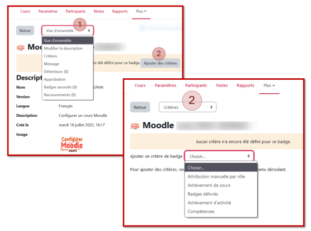 Créer un badge⚓Deux entrées sont alors prioritaires : Vue d'ensemble (1) et Critères (2)⚓