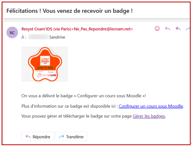Une notification de délivrance de badge sera adressée à l'auditeur, qui pourra alors le télécharger ou l'intégrer à un sac à badge en cliquant sur le lien