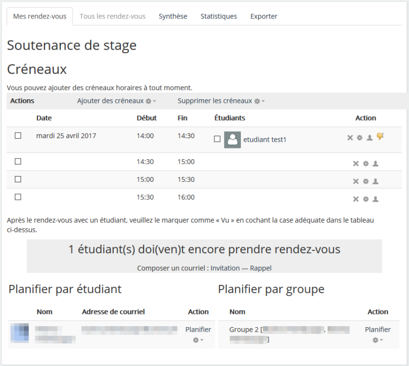 Réglages courants).« Il sera important, lors de l'ajout de créneaux, de fixer un nombre adéquat dans le nombre maximum d'étudiants par créneau. Ce nombre doit être égal ou supérieur au maximum d'étudiants dans un groupe sinon l'étudiant aura le message : «Désolé, il n'y a plus de créneaux disponibles à cette date».