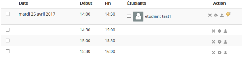 Liste des créneaux (libres comme pourvus). Dans la colonne "Étudiants" figurent les élèves inscrits à un créneau donné. Les paramètres et les inscrits d'un créneau peuvent être modifiés via les icônes de la colonne "Action".