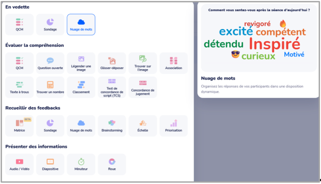 Wooclap permet de rendre un cours plus dynamique et d'impliquer les étudiants dans une gamme variée d'activités - un « événement » pouvant comporter plusieurs types de « questions » :