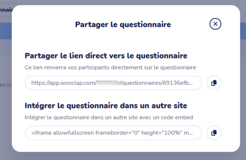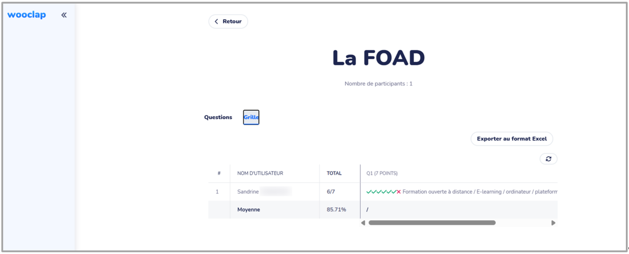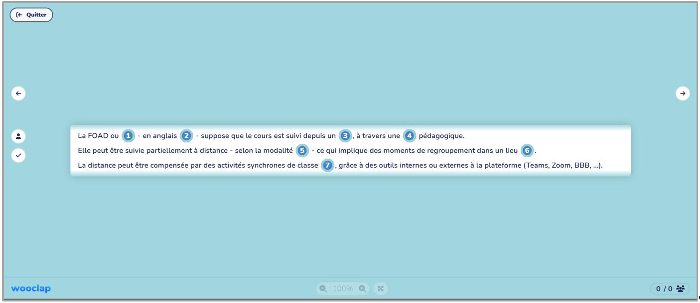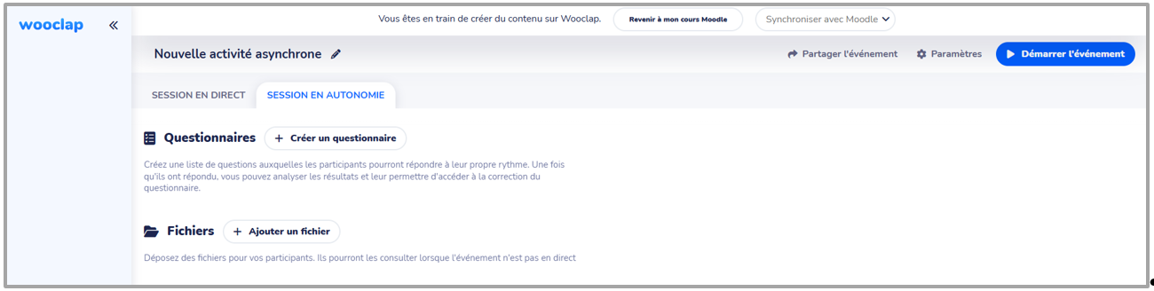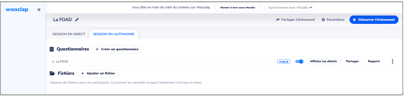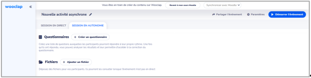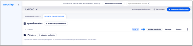 Après redirection, configurer une nouvelle activité sur Wooclap (hors options)ProcédureDécouvrez la page d'accueil Wooclap :⚓Exemple - Ici, la Session en autonomie a pu être choisie, d'où cet affichage :Accueil création activité asynchrone (hors options)Procédez aux ajouts et modifications éventuels :⚓remplacer le titre par défaut (icône crayon + touche entrée) de votre nouvelle activité,Créer un questionnaire,si besoin lui Ajouter un fichier support.Exemple - Après création - ici, « La FOAD » (texte à trous)⚓De nouvelles options apparaissent :Texte à trous asynchrone créé (hors options)Bouton de publication : pour rendre le contenu disponible, dans l'espace de cours,Afficher les détails puis Voir pour prévisualiser le texte à trous - les chiffres recouvrant les bonnes réponses :Texte à trous asynchrone : prévisualisationPartager « le lien direct vers le questionnaire » : à copier-coller dans une ressource URL du cours,Texte à trous asynchrone : partager le lien vers le questionnaireRapport pour, à postériori :vérifier les bonnes réponses aux Questions,voir quels élèves ont effectivement participé et leurs scores, via la Grille - Ici, une seule participation est enregistrée, comportant une erreur,Exporter au format PDF / format Excel :Enfin, les trois points verticaux donnent accès aux fonctions Modifier, Export, Dupliquer, Réinitialiser, Supprimer.Remarque - A noter⚓Dans ce cas de figure, il est possible de permuter l'événement de la Session en autonomie à la Session en direct.