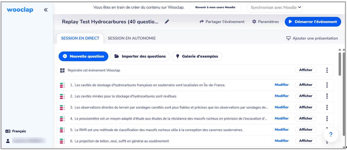 Après redirection, (re)configurer un Test ou Evénement sur WooclapProcédureRetrouvez votre contenu via l'interface d'accueil :⚓Exemple - Le contenu à rejouer est affiché directement en Session directe (rien sous Session en autonomie) :Accueil Replay Test MoodleAccueil Replay Evénement : SondageProcédez aux éventuels ajouts et modifications.⚓Selon le cas :⚓modifiez le titre (icône crayon + touche entrée) de votre Test / Evénement : la correction se répercutera dans votre cours,ajoutez éventuellement :une Nouvelle question,et/ou une présentation .ppt : pour intercaler les questions avec les diapositives,Importez des questions,Afficher (vérifier) et/ou modifier vos questions.