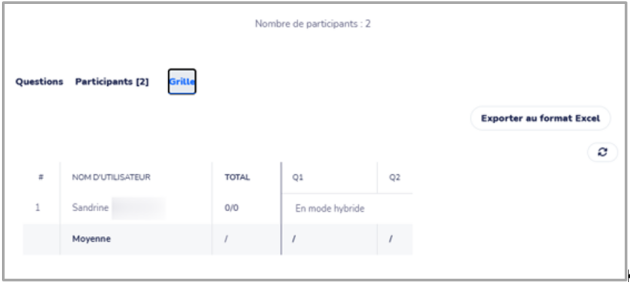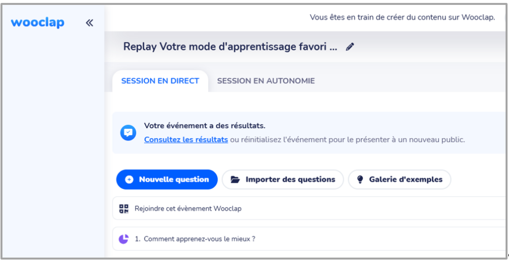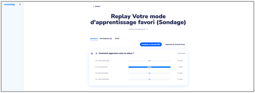Voir le détail des résultats et réinitialiser l'événementProcédureEn cliquant sur le bouton Quitter, vous verrez apparaître la mention Consulter les résultats, dans la page d'accueil de l'événement :⚓Exemple - Replay sondage : consulter résultatsCliquez ce lien pour accéder aux informations des participants effectifs et de leurs réponses :⚓Vous pourrez notamment conserver une trace de l'activité en exportant ces données.Exemple - Questions : liste des questionsReplay sondage : rapport questionsExemple - Participants : liste des participants effectifsReplay sondage : rapport participantsExemple - Grille : liste de leurs réponsesReplay sondage : rapport grilleRésultatConseil - Après consultation et éventuel export des données de réponse, effacez celles-ci.⚓En cliquant sur le bouton Retour, vous pourrez Réinitialiser l'événement, dans la page d'accueil - pour le relancer ultérieurement.
