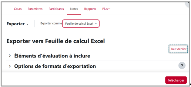 Options de formats d'exportation:Inclure les feedbacks dans l’exportationExclure les utilisateurs suspendusType d’affichage de l’exportation des notes : Brut / Pourcentage / LettreNombre de décimales des notes exportéesN'oubliez pas de
