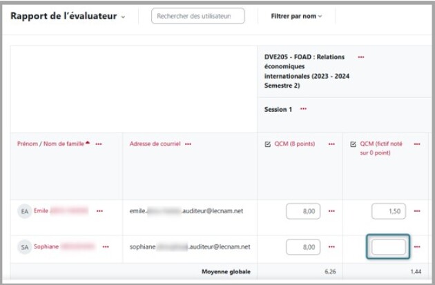 Rapport de l'évaluateur, affichant la liste des résultats par auditeur, saisissez les notes dans les champs correspondants :Truc & astuce -